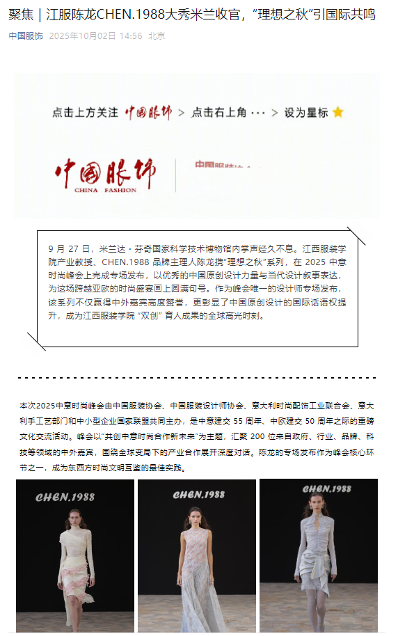 9月27日,米兰达・芬奇国家科学技术博物馆内掌声经久不息。江西服装学院产业教授、CHEN.1988 品牌主理人陈龙携“理想之秋”系列,在 2025 中意时尚峰会上完成专场发布,以优秀的中国原创设计力量与当代设计叙事表达,为这场跨越亚欧的时尚盛宴画上圆满句号。作为峰会唯一的设计师专场发布,该系列不仅赢得中外嘉宾高度赞誉,更彰显了中国原创设计的国际话语权提升,成为江西服装学院 “双创” 育人成果的全球高光时刻。