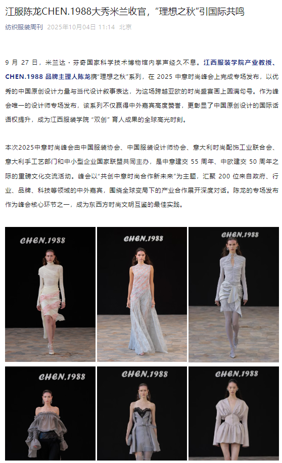 9月27日,米兰达・芬奇国家科学技术博物馆内掌声经久不息。江西服装学院产业教授、CHEN.1988 品牌主理人陈龙携“理想之秋”系列,在 2025 中意时尚峰会上完成专场发布,以优秀的中国原创设计力量与当代设计叙事表达,为这场跨越亚欧的时尚盛宴画上圆满句号。作为峰会唯一的设计师专场发布,该系列不仅赢得中外嘉宾高度赞誉,更彰显了中国原创设计的国际话语权提升,成为江西服装学院 “双创” 育人成果的全球高光时刻。