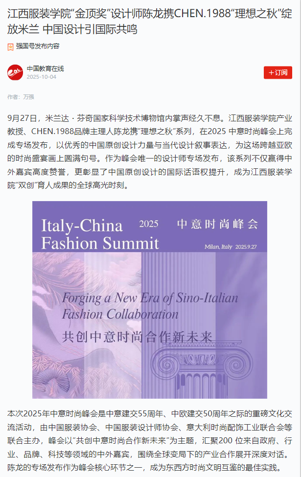 学习强国:江西服装学院“金顶奖”设计师陈龙携CHEN.1988“理想之秋”绽放米兰 中国设计引国际共鸣