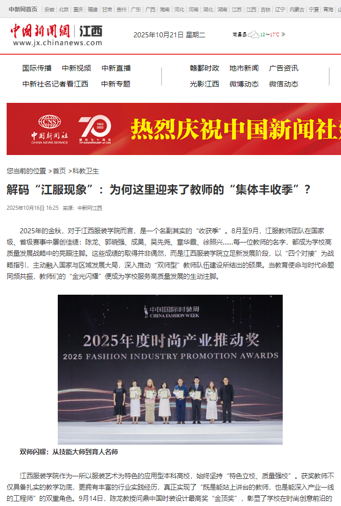 2025年的金秋,对于江西服装学院而言,是一个名副其实的“收获季”。8月至9月,江服教师团队在国家级、省级赛事中屡创佳绩:陈龙、郭晓强、成昊、吴先尧、章华霞、徐照兴……每一位教师的名字,都成为学校高质量发展战略中的亮眼注脚。这些成绩的取得并非偶然,而是江西服装学院立足新发展阶段,以“四个对接”为战略指引,主动融入国家与区域发展大局,深入推动“双师型”教师队伍建设所结出的硕果。当教育使命与时代命题同频共振,教师们的“金光闪耀”便成为学校服务高质量发展的生动注脚。