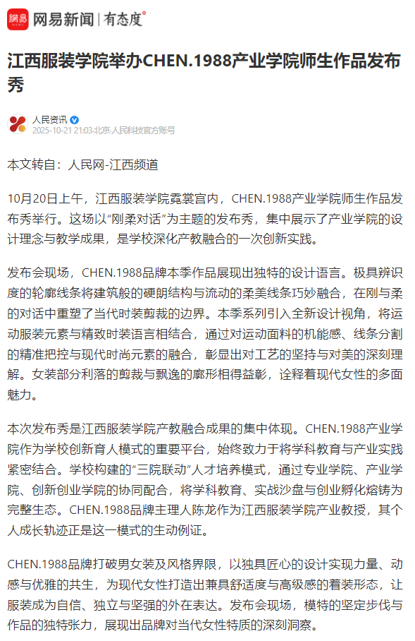人民资讯:江西服装学院举办CHEN.1988产业学院师生作品发布秀
