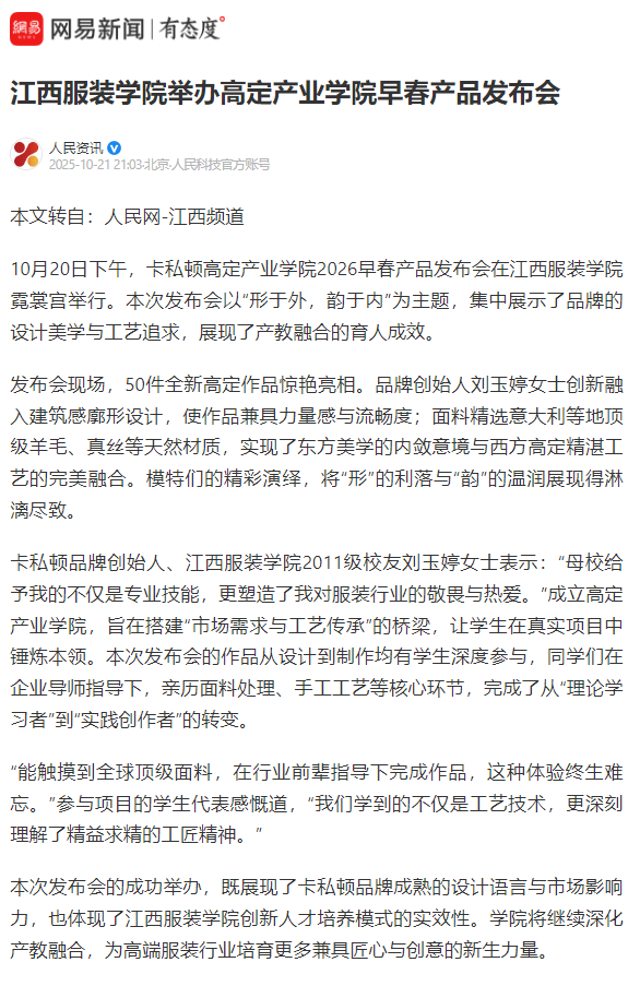 10月20日下午,卡私顿高定产业学院2026早春产品发布会在江西服装学院霓裳宫举行。本次发布会以“形于外,韵于内”为主题,集中展示了品牌的设计美学与工艺追求,展现了产教融合的育人成效。
