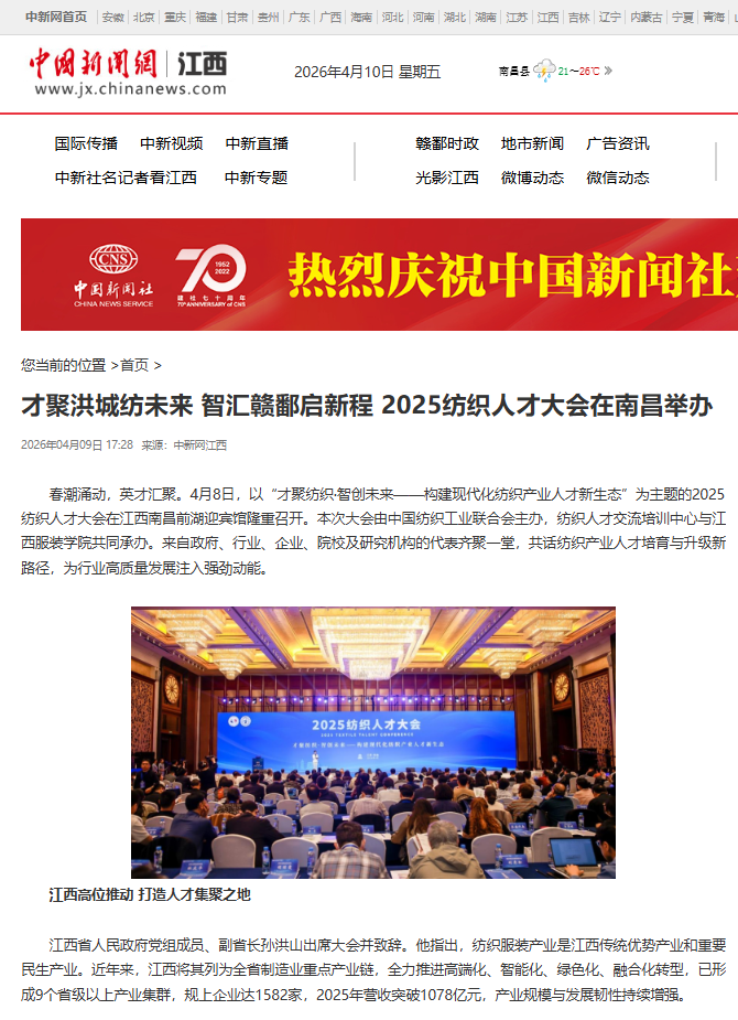 中国新闻网:才聚洪城纺未来 智汇赣鄱启新程 2025纺织人才大会在南昌举办