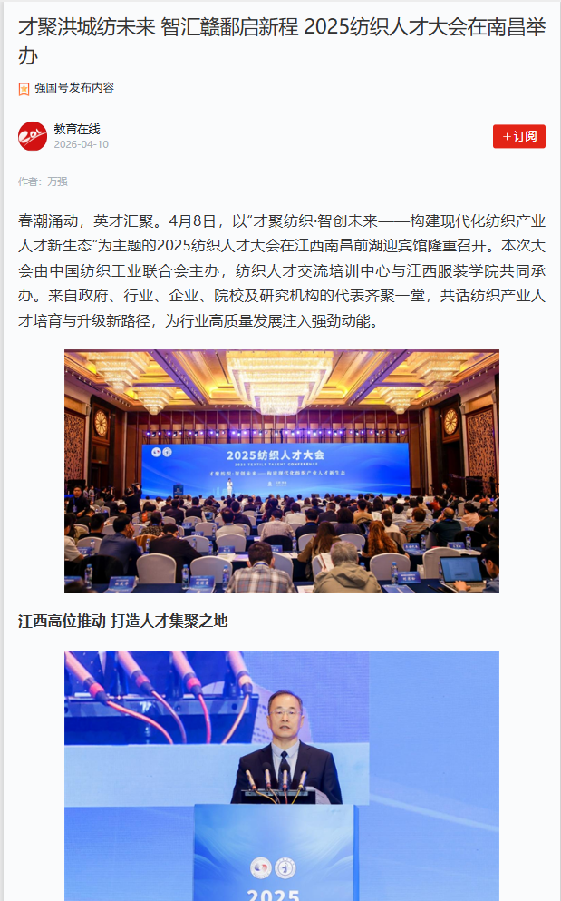 学习强国:才聚洪城纺未来 智汇赣鄱启新程 2025纺织人才大会在南昌举办