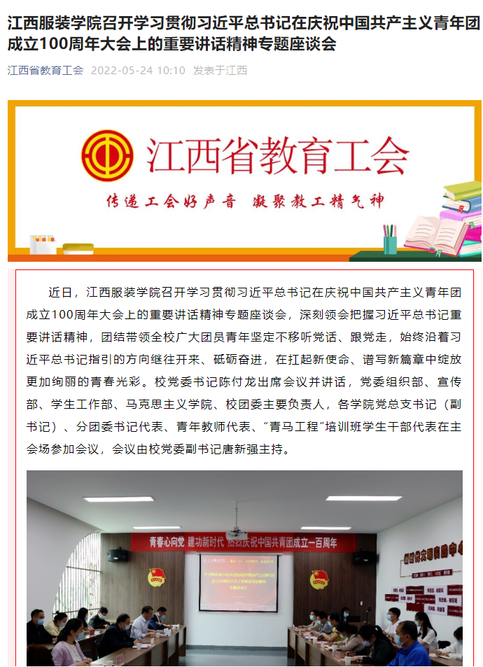 江西省教育工会:江西服装学院召开学习贯彻习近平总书记在庆祝中国共产主义青年团成立100周年大会上的重要讲话精神专题座谈会