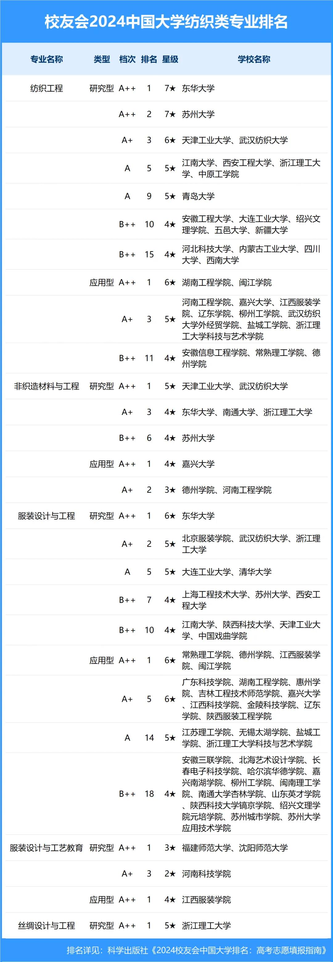 According to the list, in the Alumni Association's 2024 Chinese University Ranking of Textile Engineering Majors (Research),Donghua University was awarded the 2024 China Seven-Star Major (7★), ranking first among the world-renowned high-level majors and China's top majors.