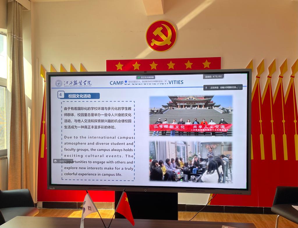 At 14:00 on 16th October 2023, our university held an online inter-university cooperation and exchange meeting with Sehan University in South Korea, which was hosted by the head of the International Exchange and CooperationDepartment. The Chinese side was represented by Gan Yingjin, deputy director of International Cooperation and Exchange Committee, the head of International Exchange and CooperationDepartment(dean of College of International Education), and the leaders ofSchool of ArtDesign andSchoolof Big Data, while the Korean side was represented by Park Sujin, dean of College of International Exchange, and Liao Xuan, vice dean of College of International Exchange. The online meeting was the first meeting between the twouniversitiesin communicating and matching the cooperation projects between them.